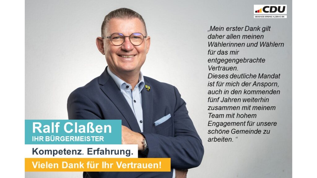 Nach dem Wahlsonntag ist der Arbeitsalltag bereits wieder eingekehrt und es ist jetzt an der Zeit, Danke zu sagen. Ich habe mich sehr gefreut und bin sehr dankbar, als Bürgermeister der Gemeinde Aldenhoven mit absoluter Mehrheit im ersten Wahlgang wiedergewählt worden zu sein.