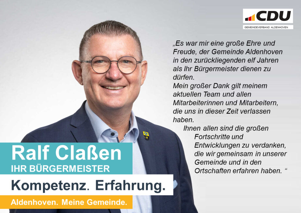 Es war mir eine große Ehre und Freude, der Gemeinde Aldenhoven in den zurückliegenden elf Jahren als Ihr Bürgermeister dienen zu dürfen. Mein großer Dank gilt meinem aktuellen Team und allen Mitarbeiterinnen und Mitarbeitern, die uns in dieser Zeit verlassen haben. Ihnen allen sind die großen Fortschritte und Entwicklungen zu verdanken, die wir gemeinsam in unserer Gemeinde und in den Ortschaften erfahren haben.