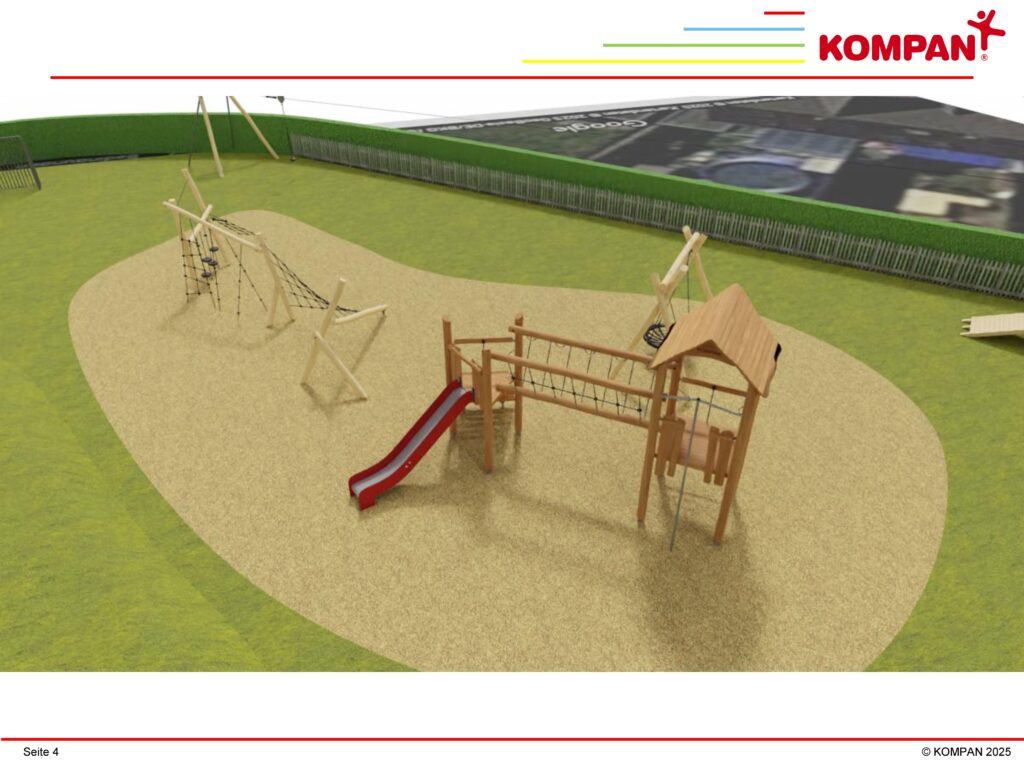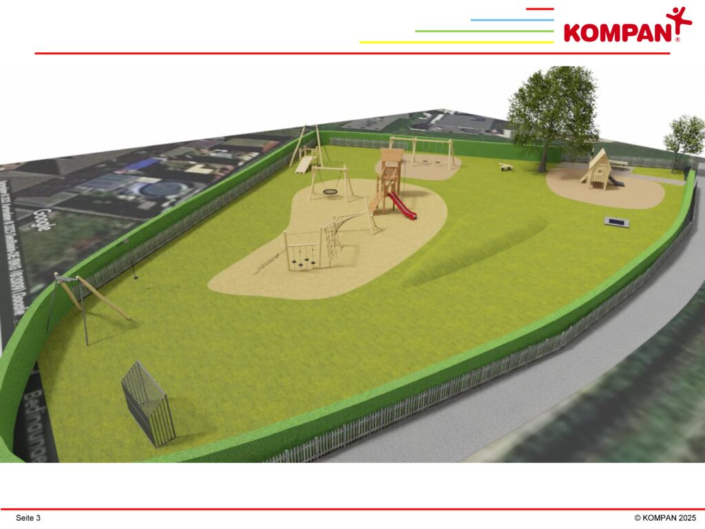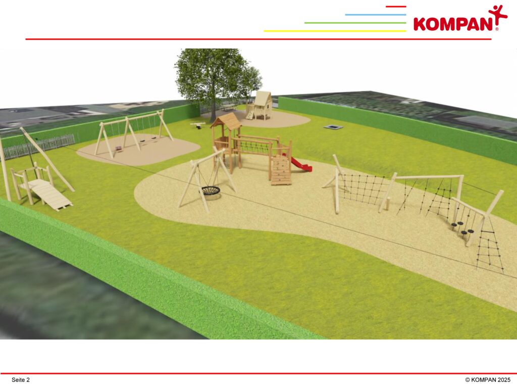 Die eingereichten Vorschläge für einen überwiegend in witterungsfestem Robinienholz gehaltenen Spielplatz wurden sortiert und in ein realisierbares Umsetzungskonzept eingearbeitet. Zwischenzeitlich hat uns ein Spielplatzanbieter daraus eine Realisierungsplanung erarbeitet und visualisiert, das den verfügbaren Platz und die zahlreichen Anregungen sowie die Sicherheitsanforderungen und Normen für Spielplätze z.B. bezüglich Fallschutz berücksichtigt.